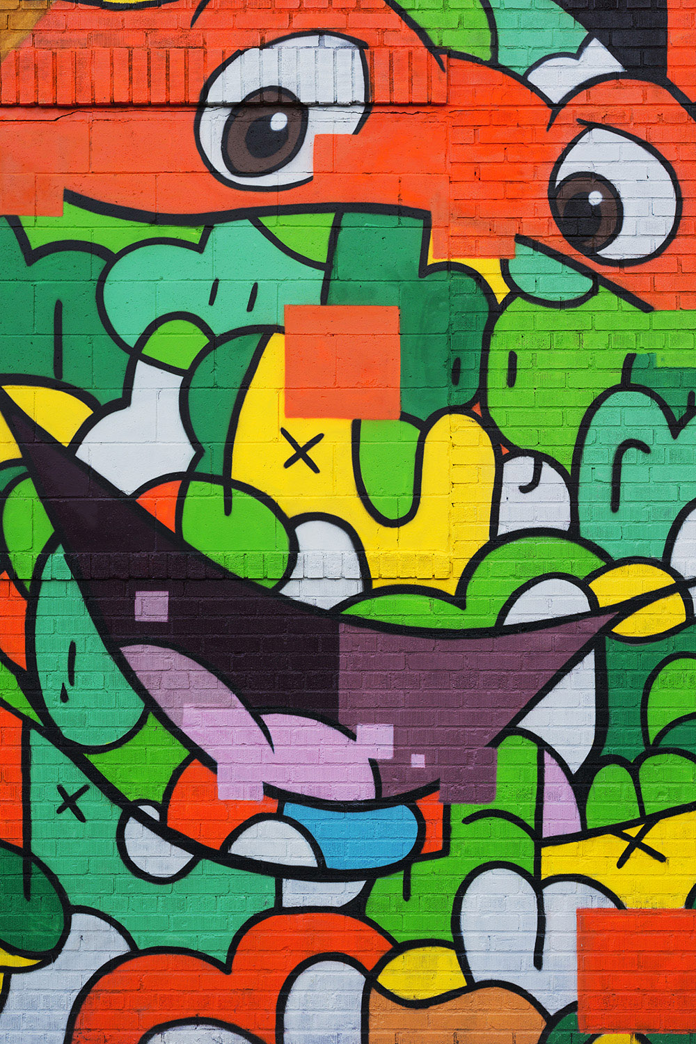 Vivid, large, and centered on an oversized cartoon character, Jerkface’s murals are unmistakable. Typically, characters’ appearance is slightly altered by repetitive patterns.